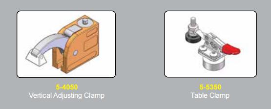 The vertical adjusting clamp can be positioned in any orientation throughout the T-slots in the table. The height adjustable lever allows various size samples up to 2.25" (57 mm) to be secured. Interchangeable pads allow handling of a variety of sample shapes. One (1) angled pad and one (1) flat pad are included.