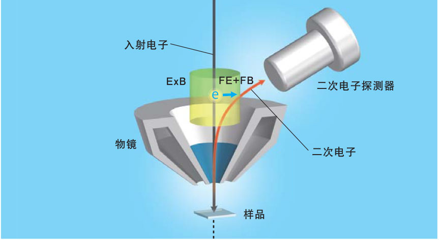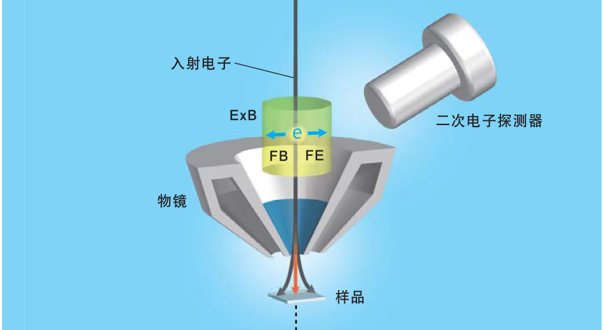 二次电子的移动方向与入射电子相反,在电场和磁场的共同作用下,使二次电子向二次电子探测器方向偏转,由此可实现二次电子的高效检测。