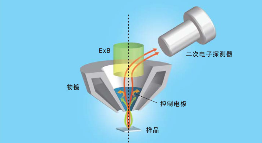 在物镜上方形成正交电场和磁场(ExBField)后,无需改变入射电子的运动轨迹,即可高效检测二次电子。因此,即使导入极小的探针电流也可以获得高信噪比和高衬度的图像。