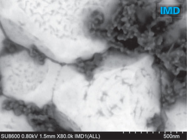 (中)IMD图像显示有微小的轻元素材料分布在金属氧化物颗粒上。