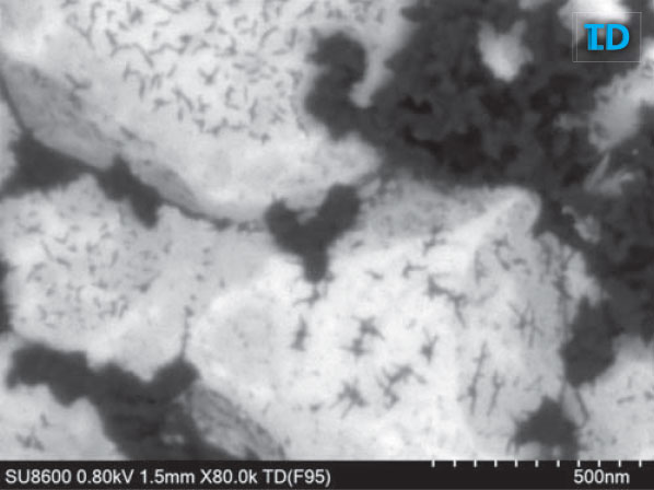 (右)TD图像增强了元素对比度,可以看到金属氧化物颗粒上覆盖着另一薄层轻元素材料。