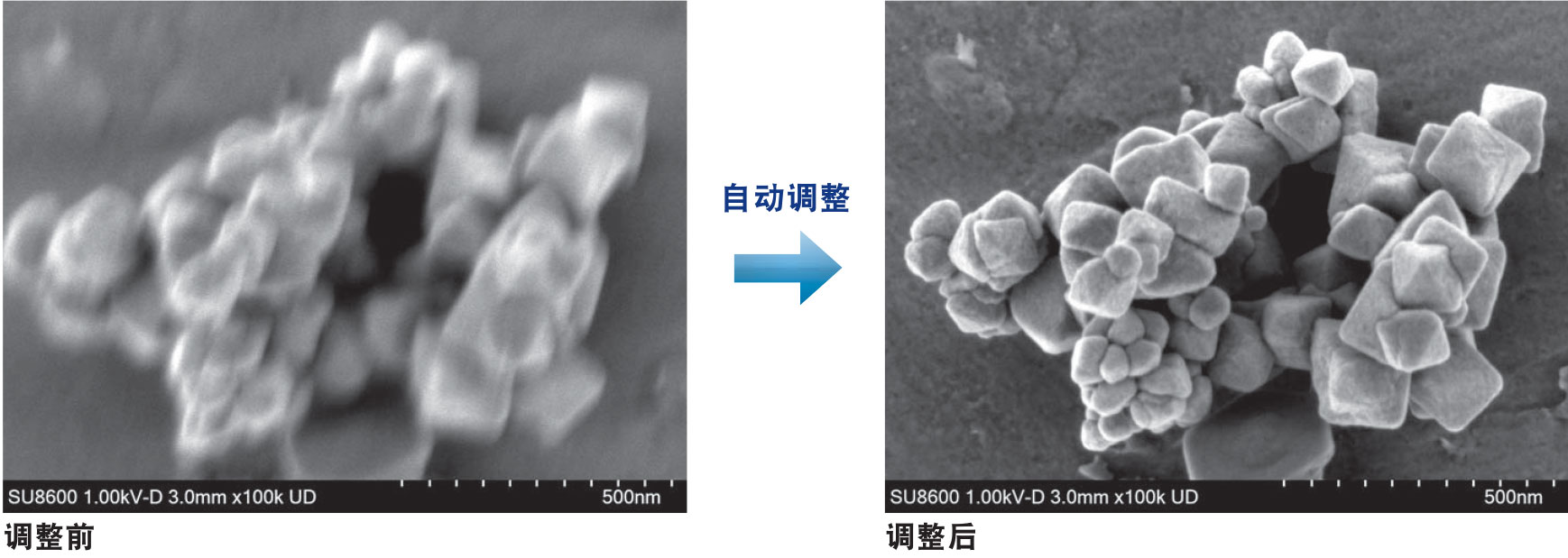以上为0.8kV电压条件下观察RHO型沸石的实例。左图为颗粒整体的形貌,右图为放大图像,颗粒表面细微的台阶结构清晰可见。低电压观察对于减少电子束损伤和获取表面形状信息较为有效。