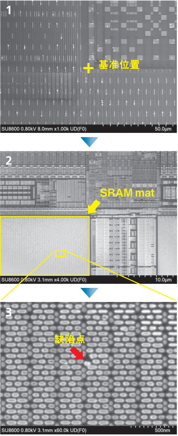 拍摄半导体器件的缺陷:1.自动设置SEM观察条件,并移动至基准位置。