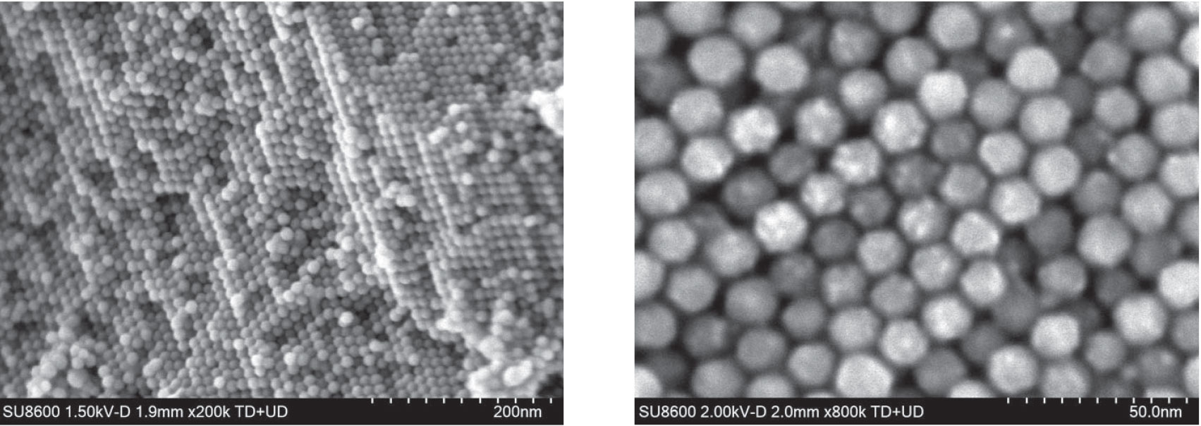 左图:排列整齐的氧化铁自组装磁性纳米颗粒