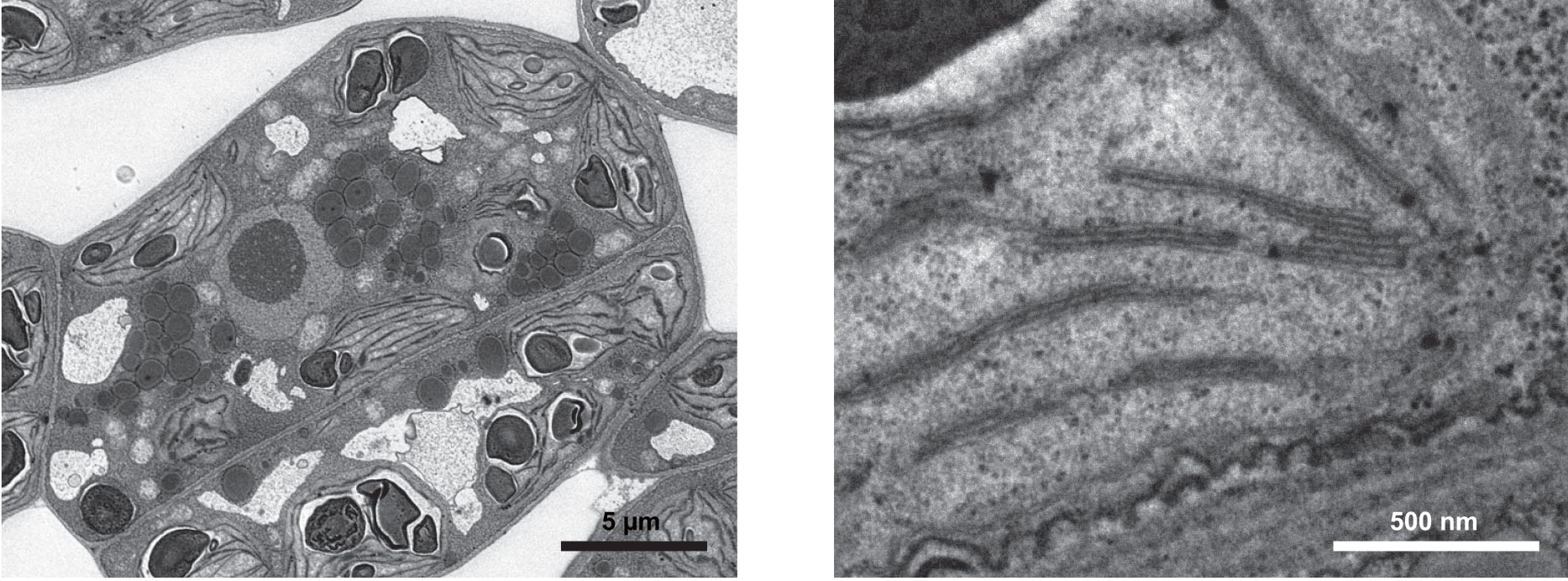 使用能量过滤的BSE信号,可清晰的观察到囊体膜等超微结构(右图)。