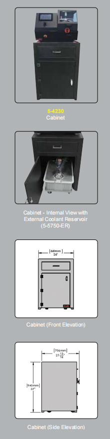 The 7-gallon (26.5 L) recirculating coolant system is constructed of corrosion resistant materials for maximum durability. The reservoir fits conveniently in the available cabinet, or can be placed near the machine in existing lab furniture. A removable catch screen enables quick cleaning of larger particles. Baffles inside the reservoir trap particulates. The optional roller cart (included with cabinet) allows easy transfer for cleaning.