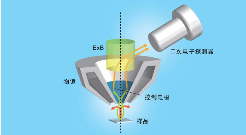 在物镜上方形成正交电场和磁场(ExBField)后,无需改变入射电子的运动轨迹,即可高效检测二次电子。因此,即使导入极小的探针电流也可以获得高信噪比和高衬度的图像。