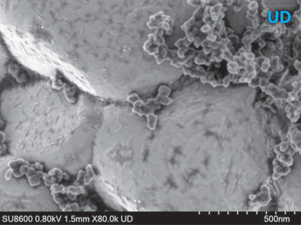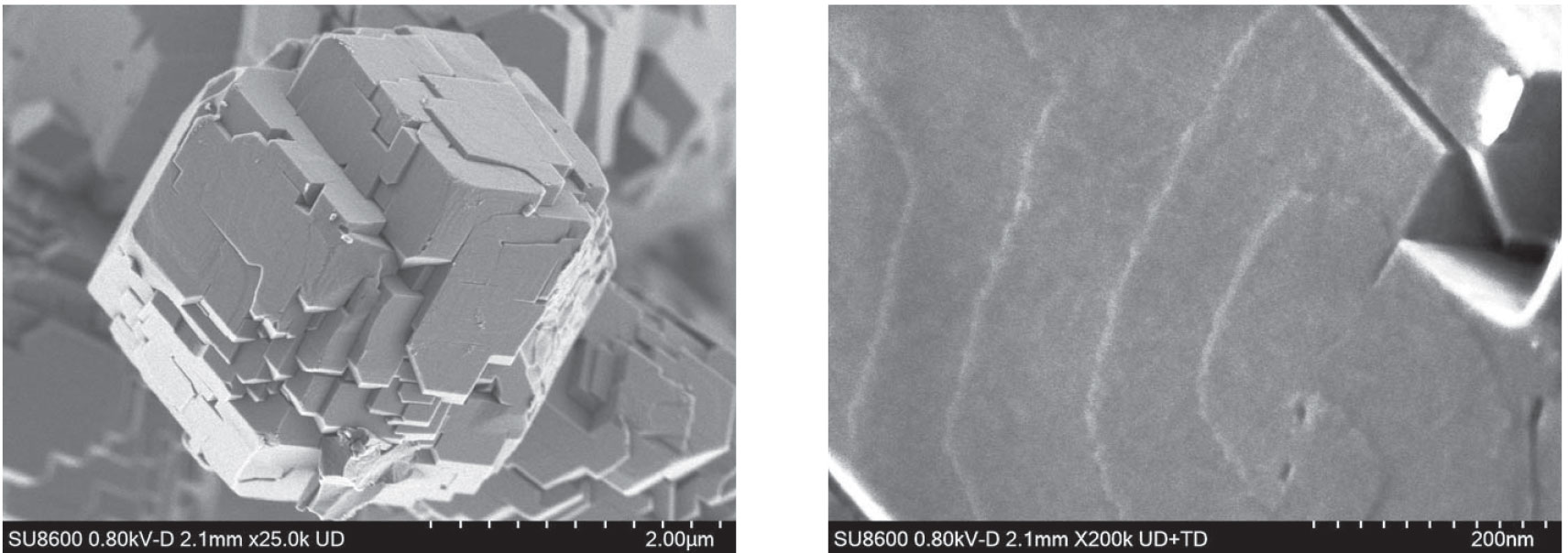 以上为0.8kV电压条件下观察RHO型沸石的实例。左图为颗粒整体的形貌,右图为放大图像,颗粒表面细微的台阶结构清晰可见。低电压观察对于减少电子束损伤和获取表面形状信息较为有效。