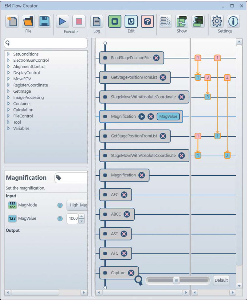 EMFlowCreator将不同的SEM功能定义为图形化的模块,如设置放大倍率、移动样品位置、调节焦距和明暗对比度等。