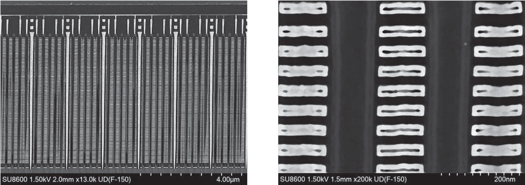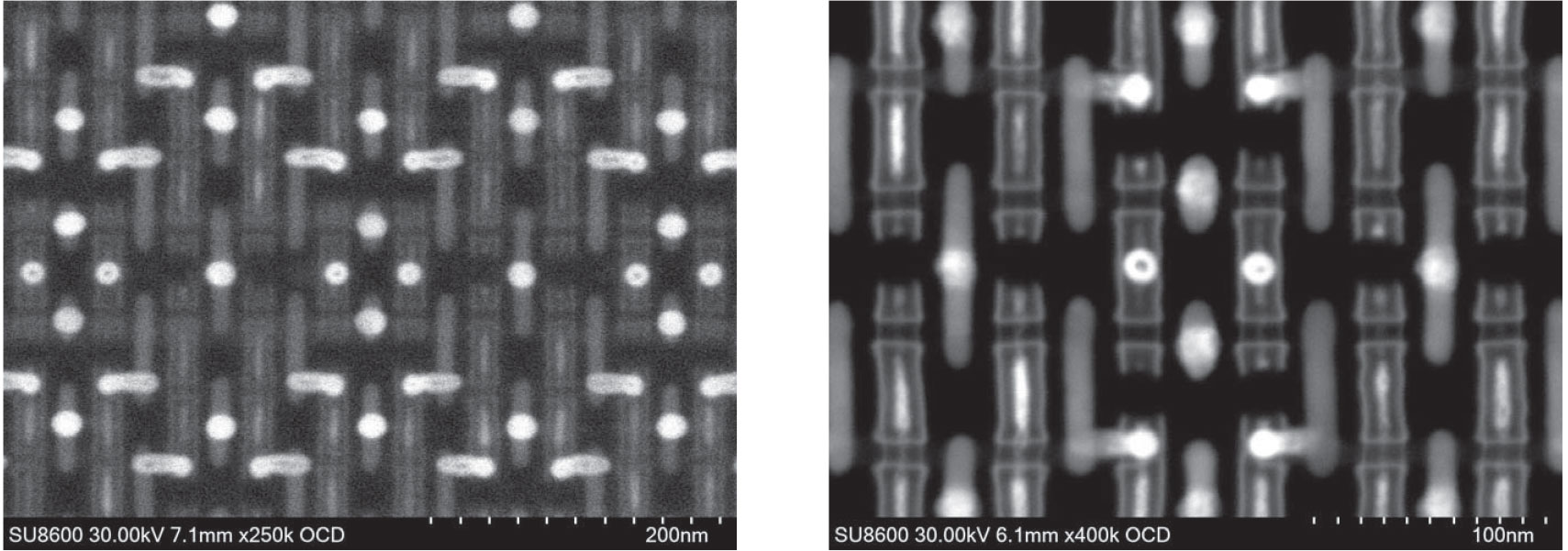 左图:可观察到Fin-FET的内部结构。由于使用了新型的OCD探测器,即使拍照时间不到1秒,也仍然可以观察到清晰的结构图像。