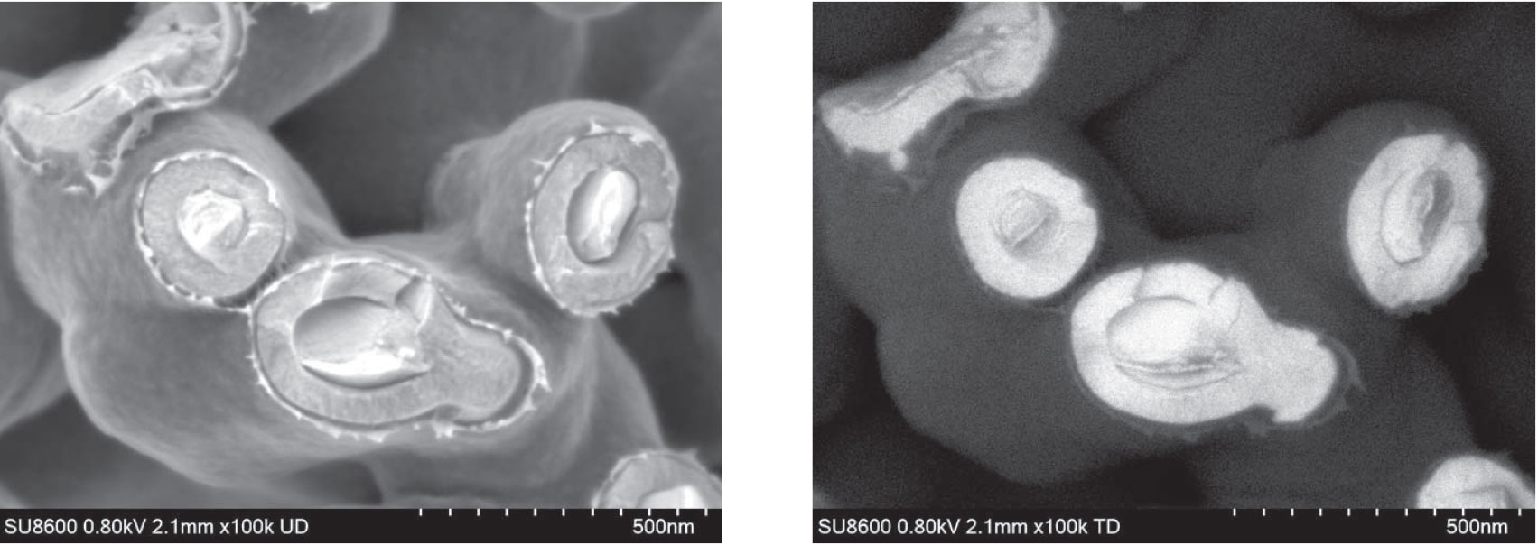 使用能量过滤的BSE信号,可清晰的观察到囊体膜等超微结构(右图)。