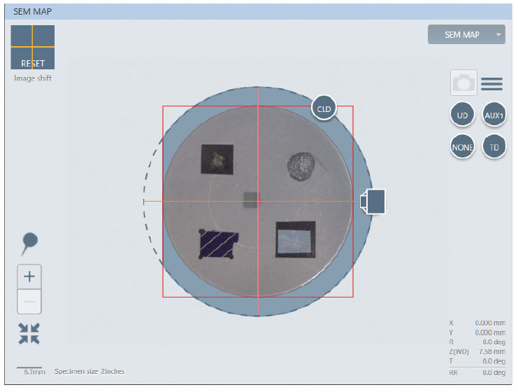 自动拍摄样品台的图像,并传输到SEMMAP画面上,方便导航观察位置,快速切换观察区域。